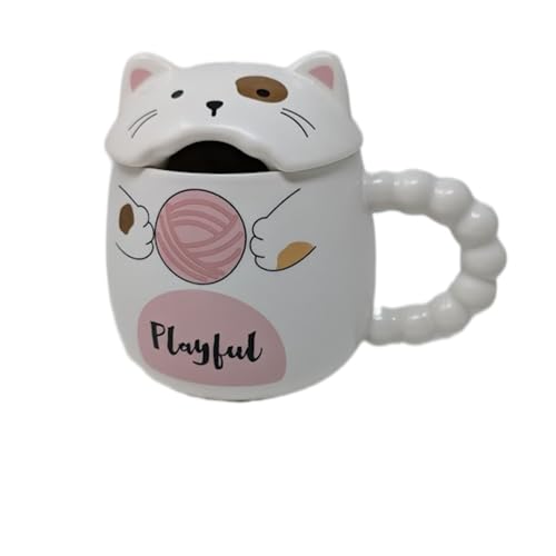 JRose Collections Cute Cat Mug with Lid and Spoon – “Playful” White Ceramic Coffee Cup – Kawaii Animal Mug for Girls Teens Kids Women – Fun Novelty Gift for Tea, Milk, Hot Chocolate or Office Desk