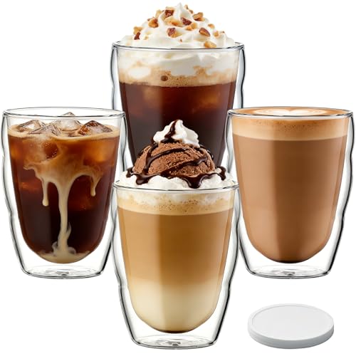 CxutSa 4x450ML Double Walled Glass Coffee Mugs with Coaster Latte Glasses Cappuccino Espresso Cups Large Borosilicate Insulated Coffee Cup for Tea Milk Juice Ice Cream Dessert Beer Hot Cold Drinks