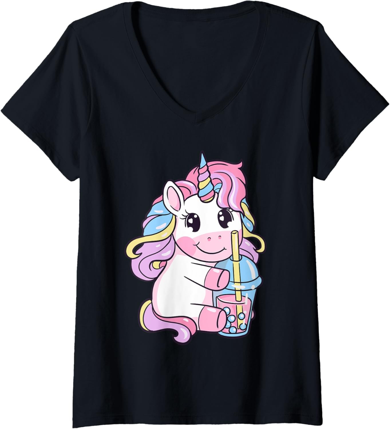 Womens Kawaii Bubble Tea | Unicorn Boba Tea for Milk Tea Lover V-Neck T-Shirt