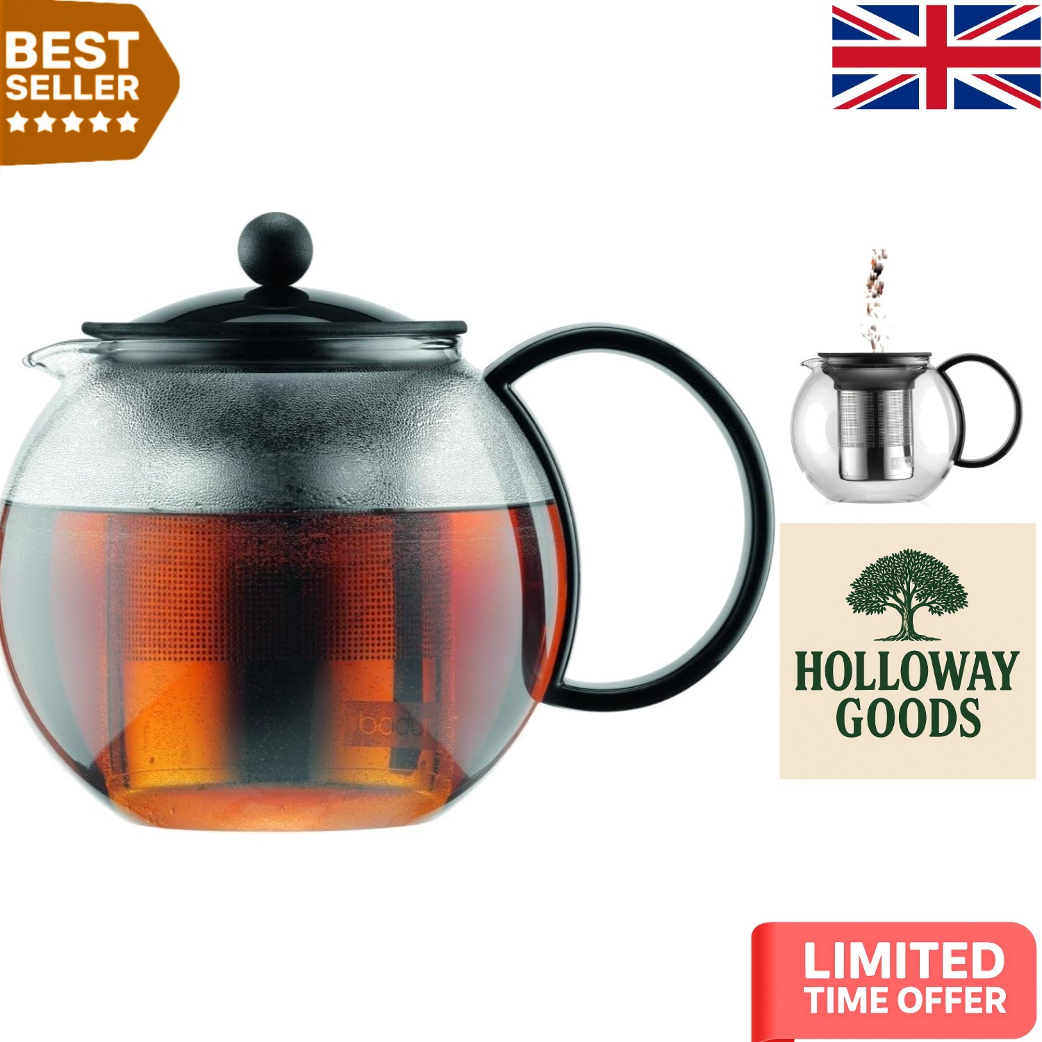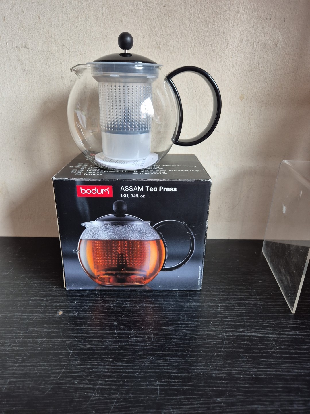 BODUM Assam Glass Tea Press Pot Infuser 1L Black Lid/handle (P9)