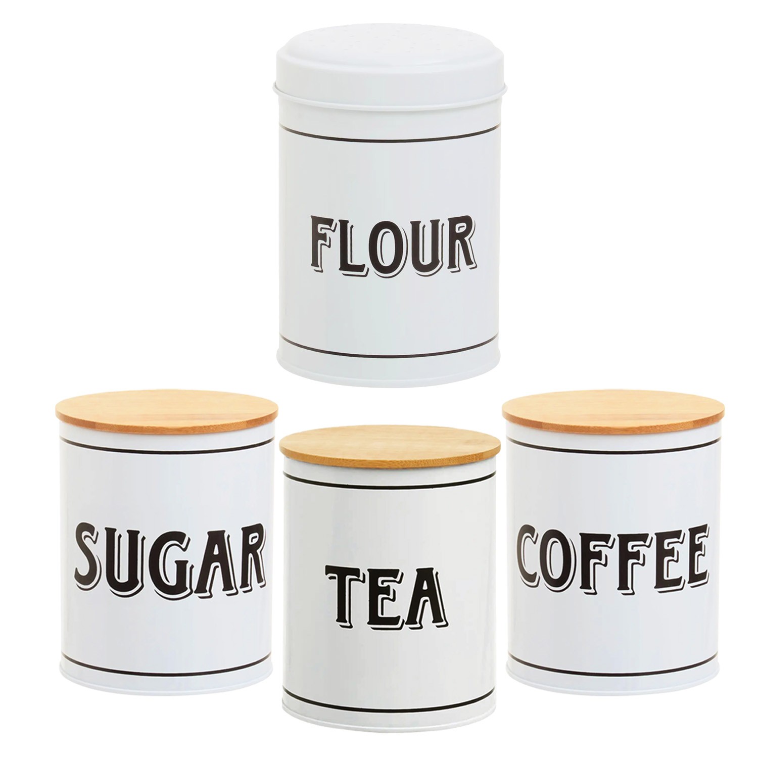 White Metal Tin Tea Sugar Coffee Flour Canister Set w/Lid Storage Containers 4pc