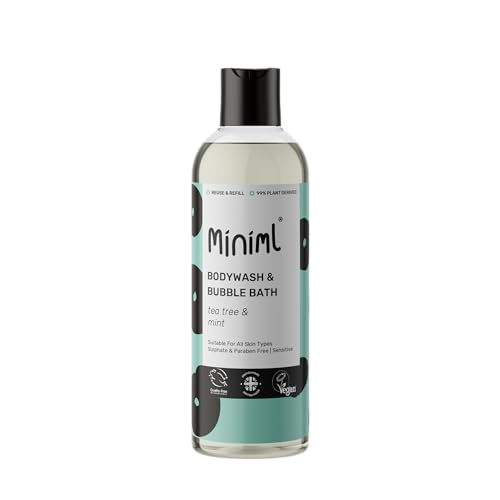Miniml All Natural Body Wash and Bubble Bath - 500ml Moisturising Tea Tree & Mint Sensitive Skin Eco Shower Gel Bath Soak - Vegan Friendly High Foam