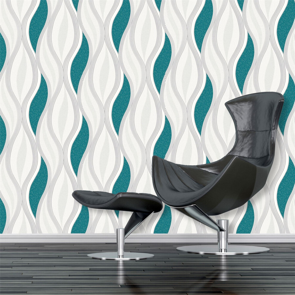Teal Green Waves Silver White Glitter Textured Vinyl Feature Wallpaper
