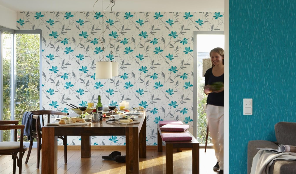Teal Silver Floral Wallpaper Erismann Textured Glitter White Vinyl Design