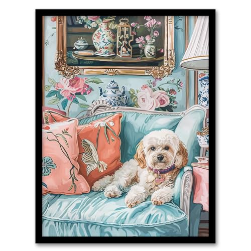 Artery8 Cockapoo Dog Lover Pink Teal Couch Pet Portrait For Living Room Artwork Framed Wall Art Print A4
