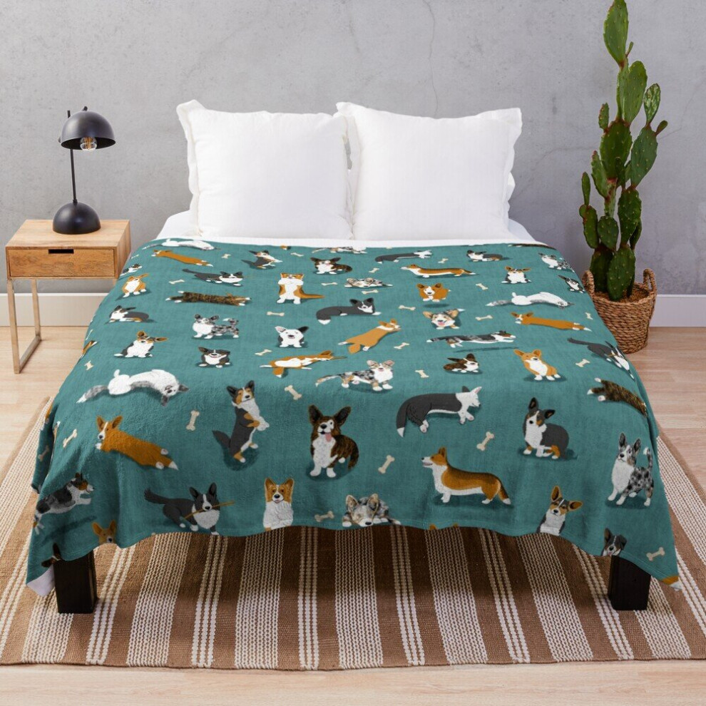 Fleece Throw Blanket Cardigan Corgi Pattern on Teal for Sofa Couch Kids 60 x 50 Inches
