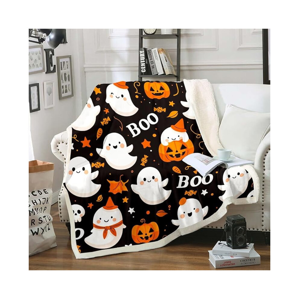 Happy Halloween Sherpa Blanket Decoration, Pumpkin Lantern Fuzzy Blanket for Kids Boys Girls, Spooky Cat Bat Design for Sofa Bed Couch, Teal Blue,