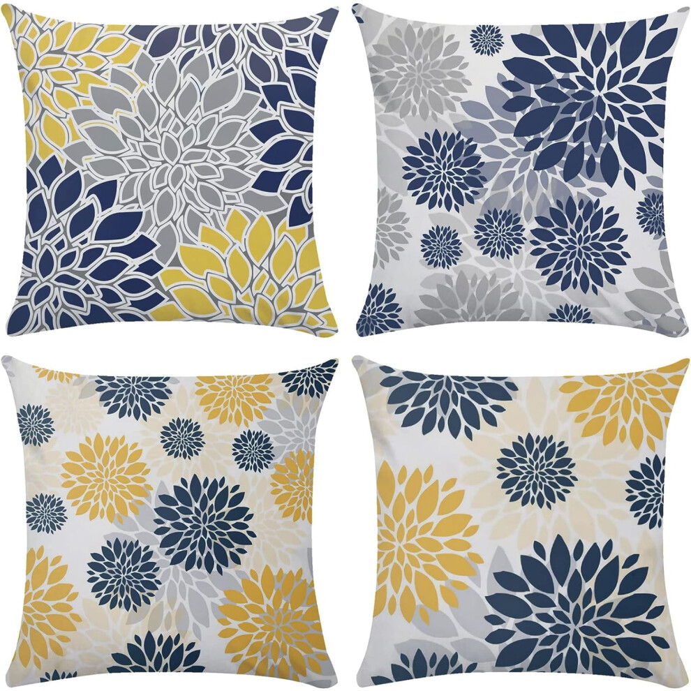 Navy Blue & Yellow Dahlia Throw Pillow Covers 18x18, Set of 4, Teal/Gray Floral Cushion Covers for Sofa, Bed, Living Room