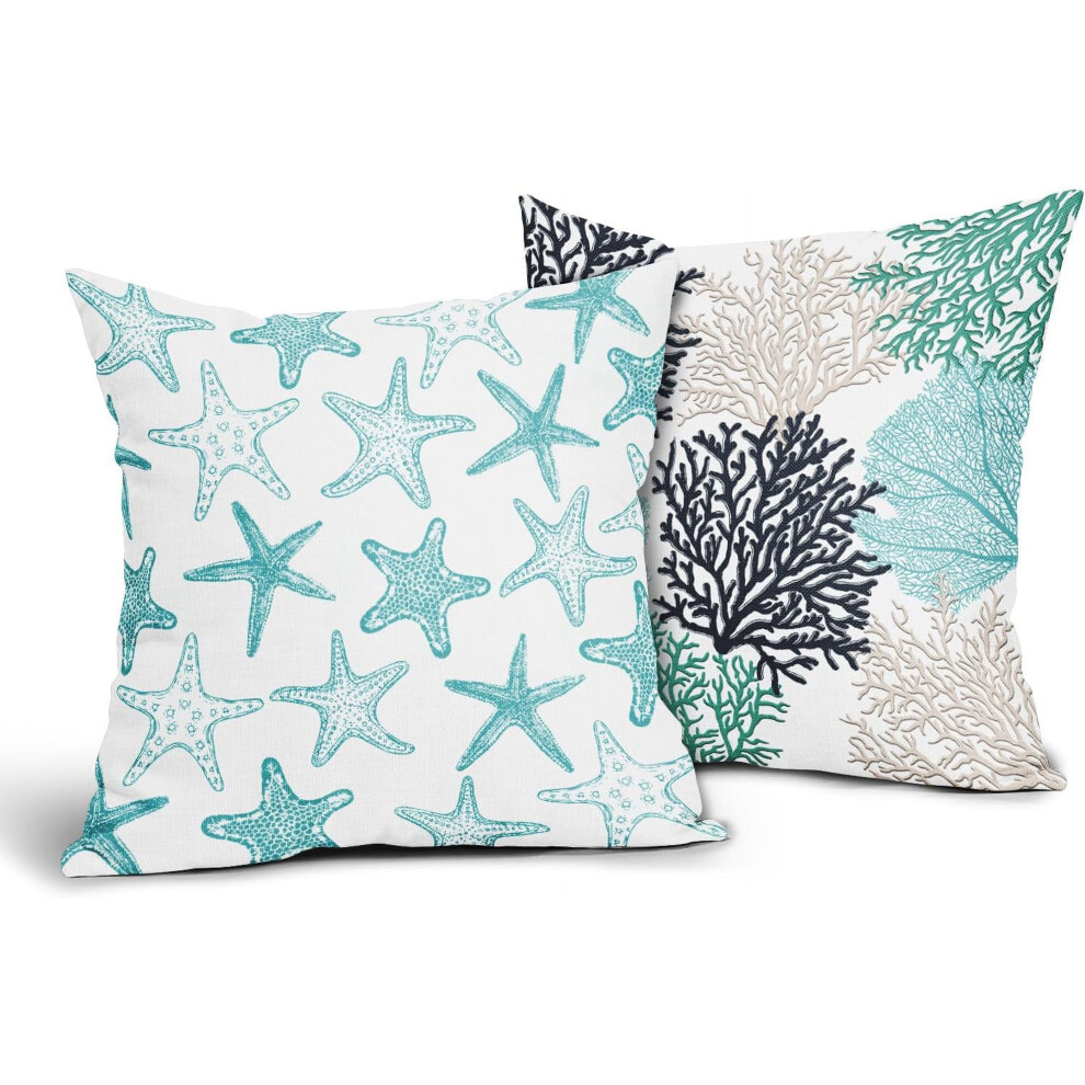 Summer Nautical Throw Pillow Covers 18x18", Beach Starfish Coral Design, Teal Ocean Outdoor Cushion Covers, Cotton Linen, for Couch/Sofa/Bedroom