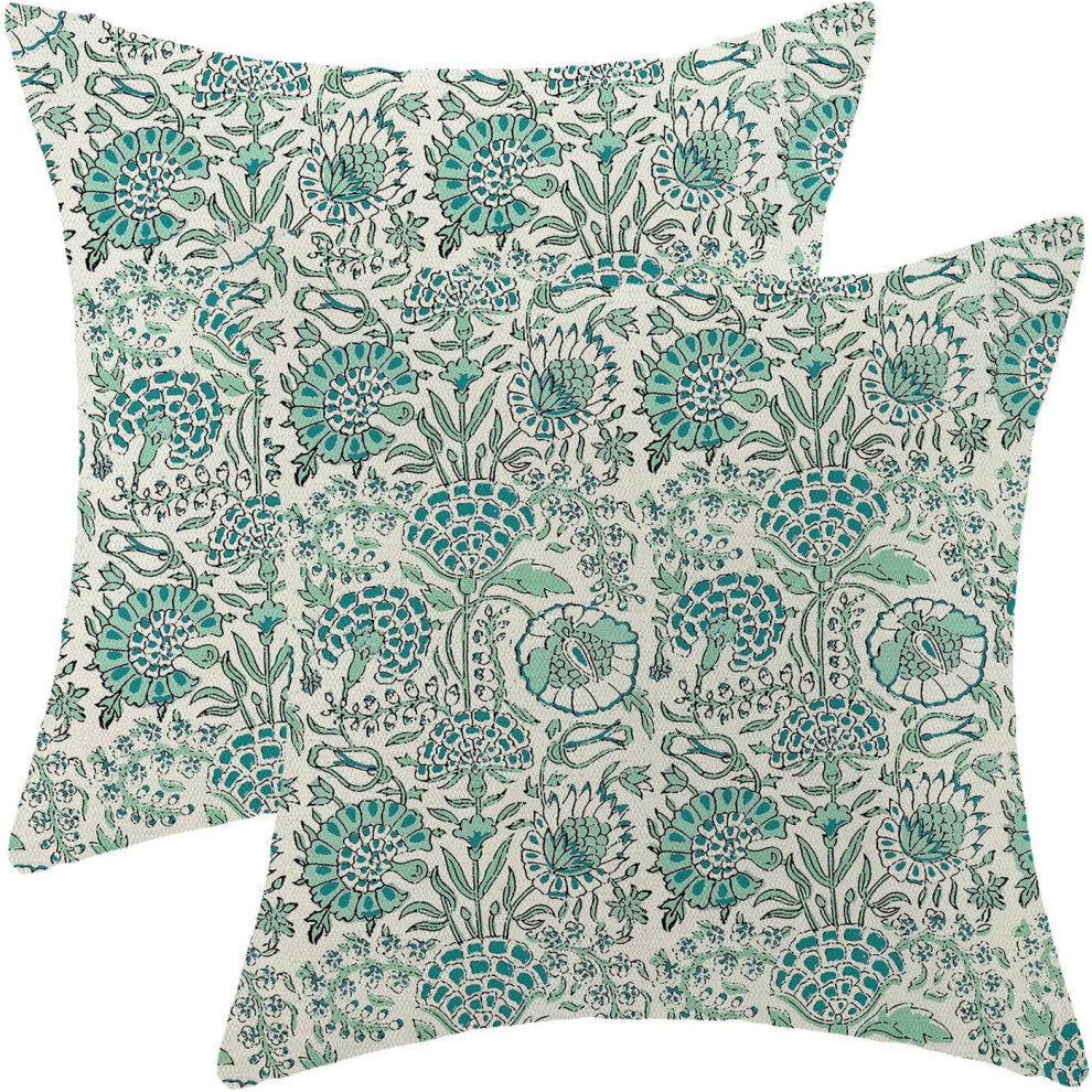 Block Print Pillow Covers 18x18, Pack of 2, Teal Floral Linen Cushion Covers for Sofa/Couch â Boho & Farmhouse Decor