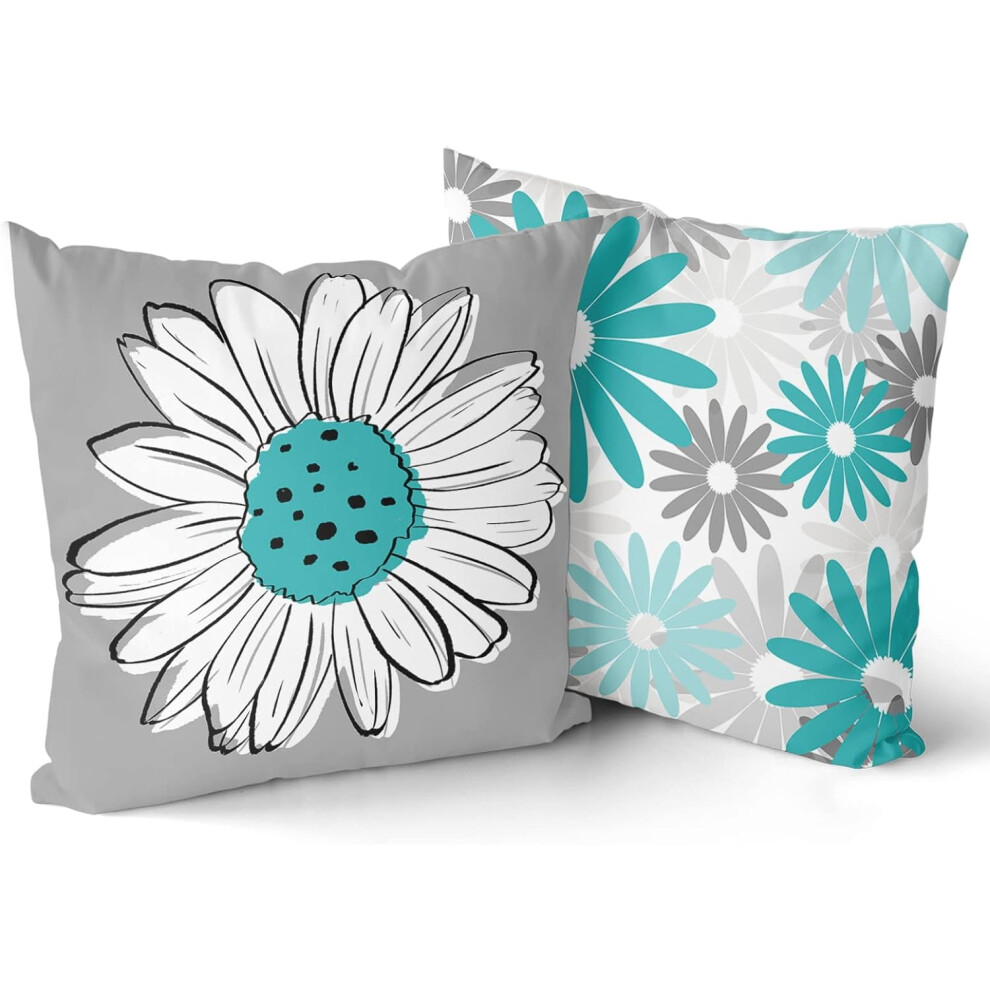 Grey & Blue Daisy Pillow Covers Set of 2, 18x18", Teal Floral Cushion Covers for Couch, Bed, Outdoor â Modern Home Decor