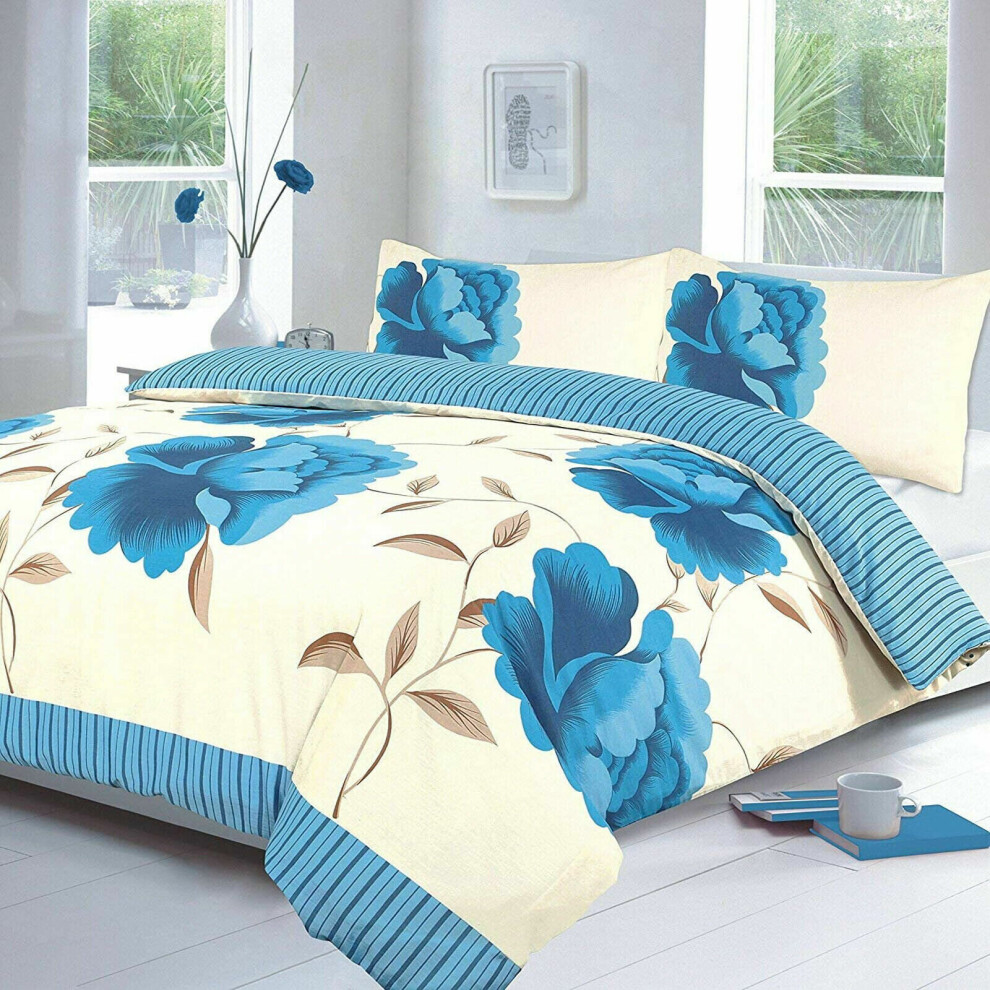 Hotel Quality King Printed Rose Teal Floral Design Duvet Cover Set Bedding Set with pillowcases - King Size