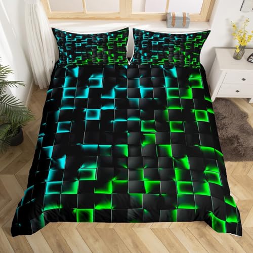 Homewish Neon Black Teal Boys Duvet Cover Double Geometric Checkered Turquoise Bedding Set for Kids Teen Men Gaming Room Decor, Abstract Ombre Plaid Quilt Cover Grids Bed Set, Microfibre