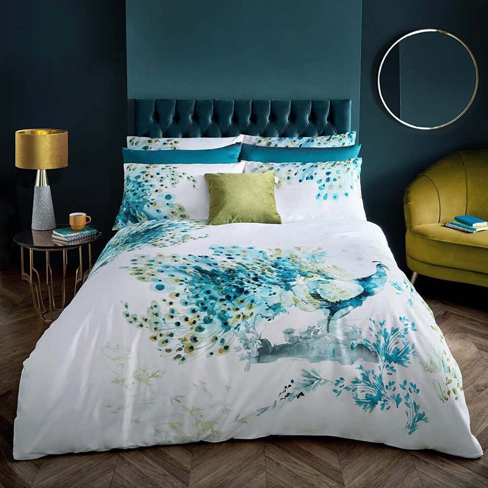 Laurence Llewelyn-Bowen - Teal Peacock Feathers Duvet Cover - King Bedding Size (230 x 220cm) - 2 Pillowcases - Jacquard Bedding Set in Teal - Luxury Bedding - Peacock Bird Duvet Cover 4% Metallic