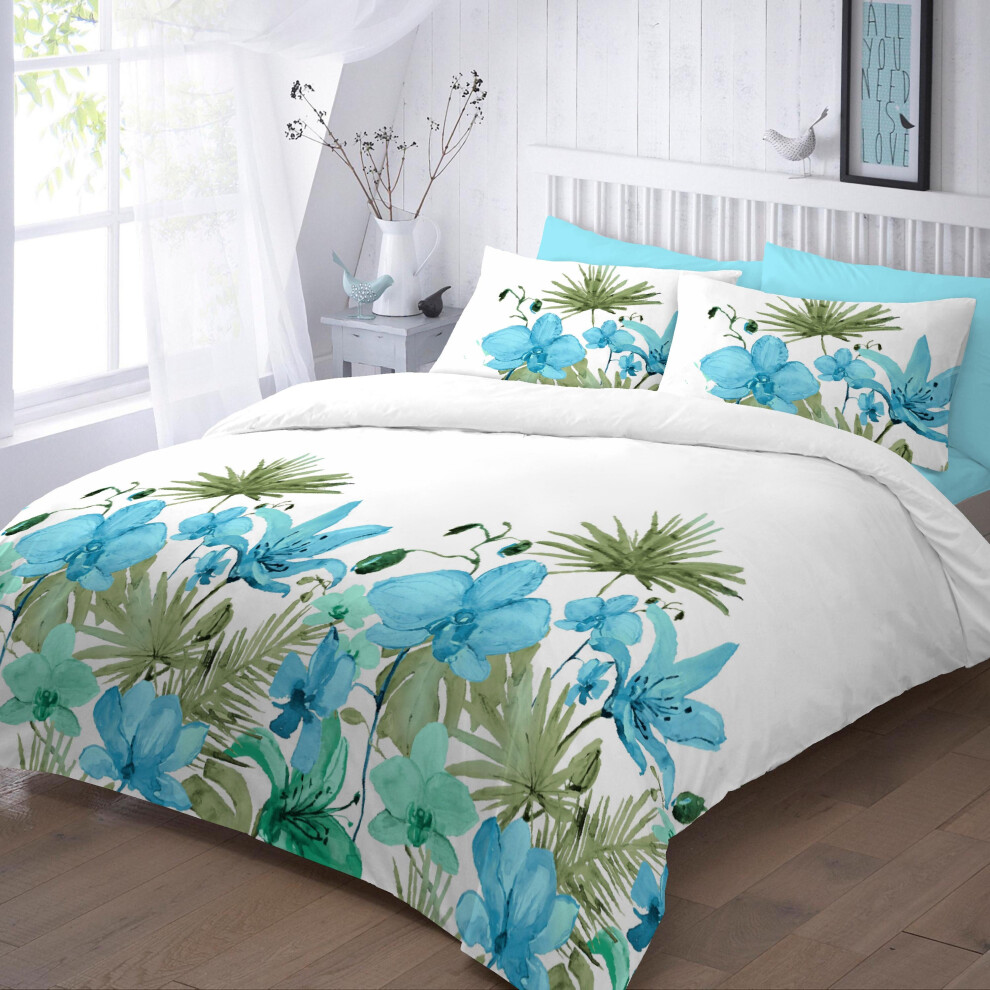 (Super King , Lily Teal) Lily Floral Duvet Cover Set with Pillowcase