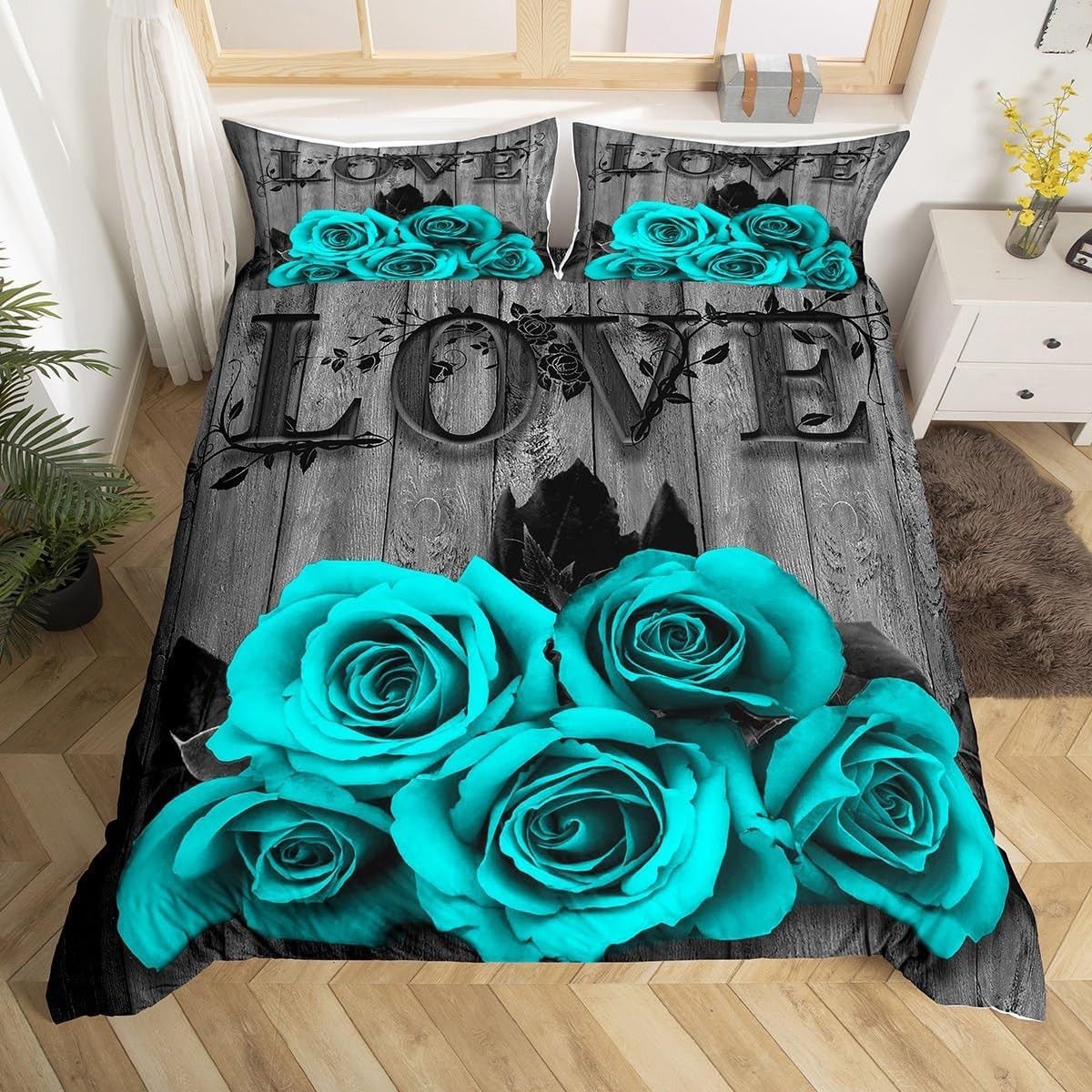 Turquoise Grey Bedding Set Teal Rose Flowers Duvet Cover Double for Girls Men W