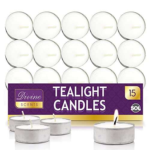 SOL 15pk Unscented Tealight Candles - 3.5 Hour Burn Time - Long-Lasting and Ideal for Home, Relaxation, Romantic Dinners, Weddings, Festive Decor, Cosy Evenings