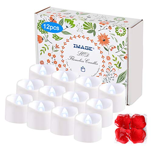 IMAGE Tea Lights 12Pcs LED Tealight Candles with Timer Flickering Battery T-Lights with 100pcs Decorative Fake Rose Petals for Christmas Halloween Wedding Birthday Anniversary, Cool White