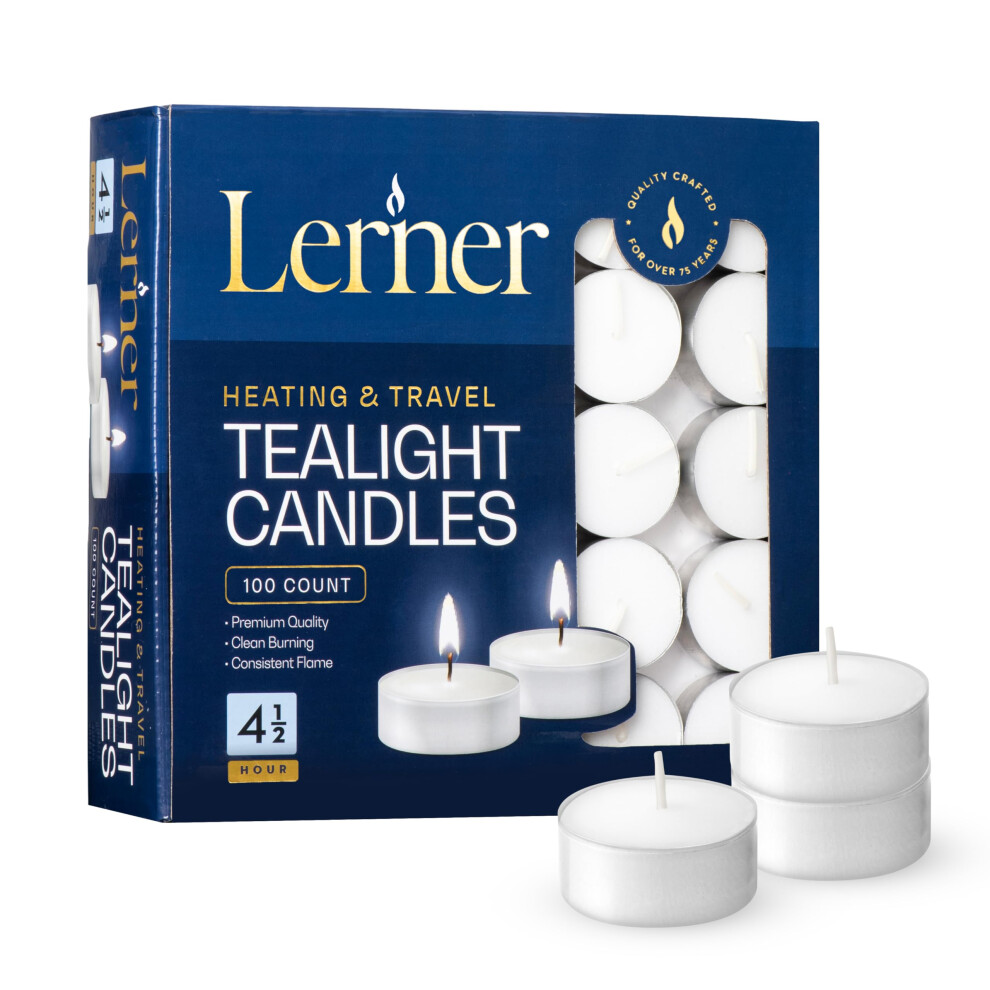 Lerner Tealight Candles, 100 Count| 4.5 Hours Long-Burning White Tea Light Candles| Non-Toxic, Smokeless & Soot-Free Tea Light Warmer Candles | Unscen