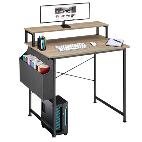 TecTake® Computer Desk with Built-in Monitor Stand & Side Storage Bag, Home Office Desk with Sturdy Steel Frame & Wooden Tabletop, Ideal Living Room & Study Table, 80 x 55 x 90 cm - Light Wood