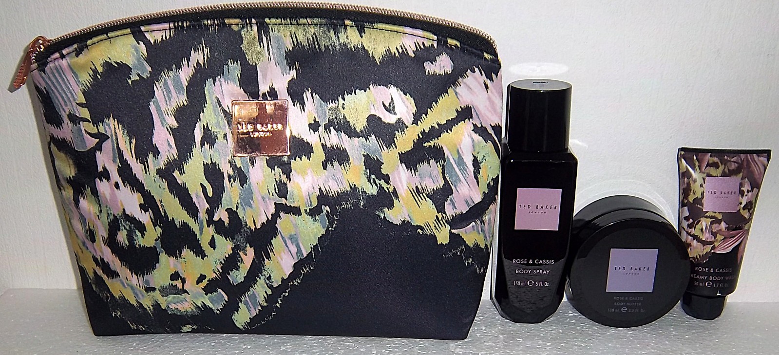 TED BAKER ROSE & CASSIS BODY SPRAY 150ML + BODY BUTTER + GEL + LARGE MAKEUP BAG