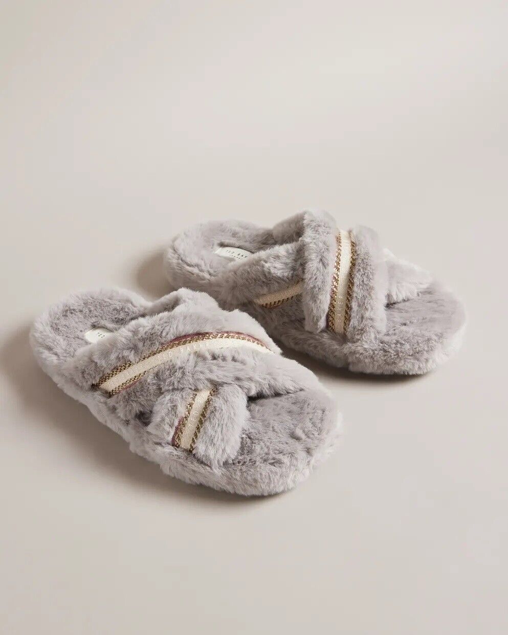 Ted Baker ❤️ Light Grey Topply Faux Fur Slippers Size 4 37 ❤️ Boxed Gift Set £45