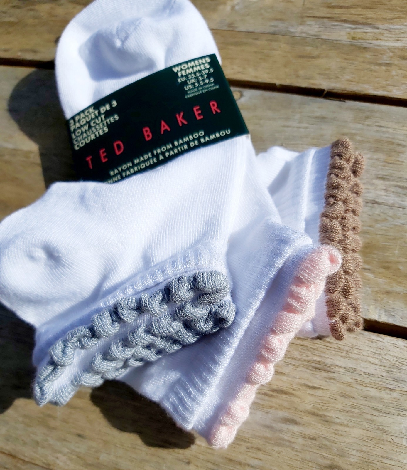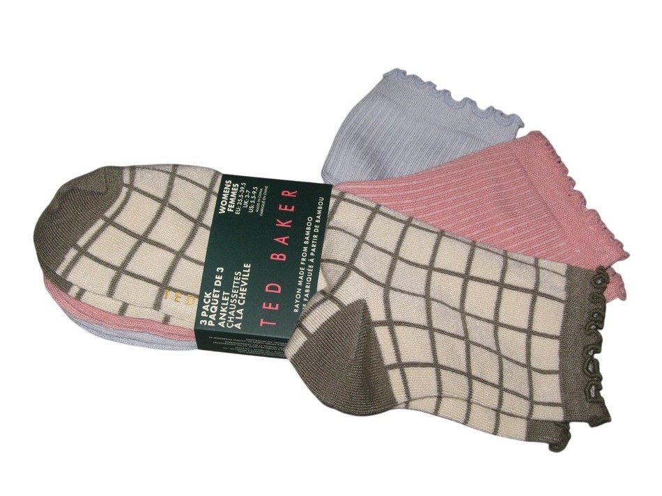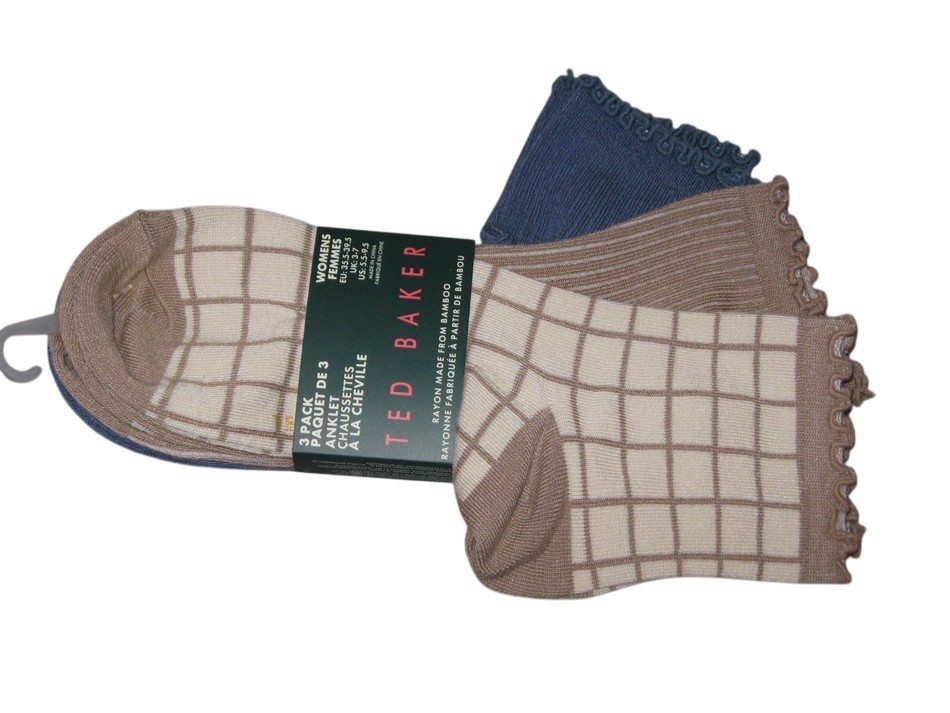 TED BAKER Ladies Ruffled Bamboo Anklet Socks 3 Pairs Size 3 - 7 Blue Brown