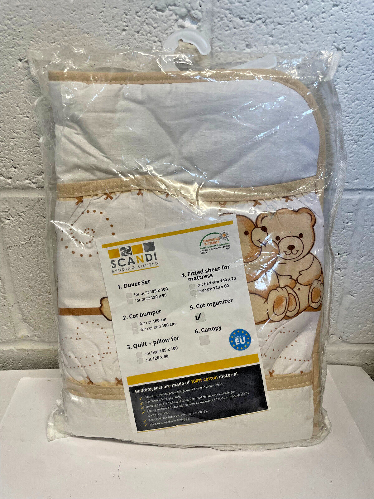 Scandi Bedding Cot Organiser White & Brown Teddy Bear Design for Cot Bed - New