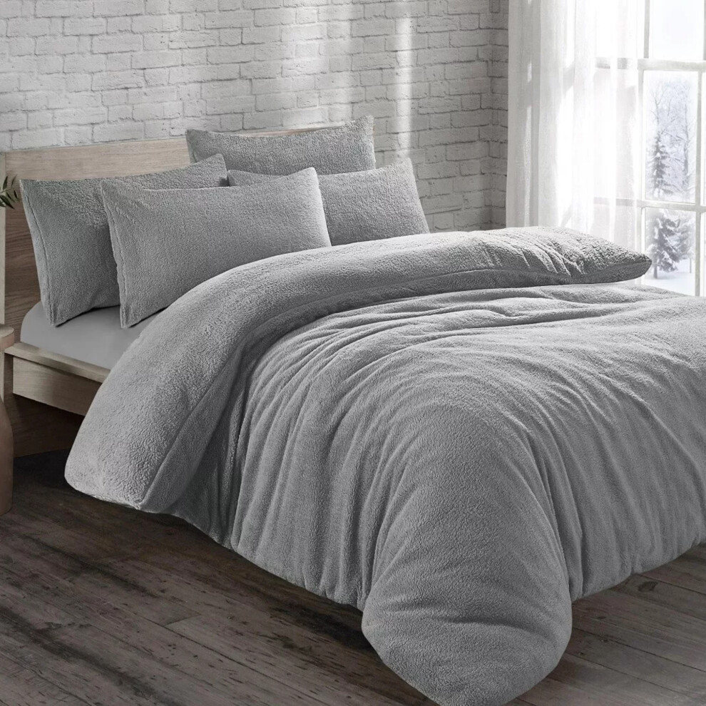 (Silver, Double) Teddy Bear Duvet Cover Fleece Bedding Set With Pillowcases Extra Warm Cosy in All Sizes