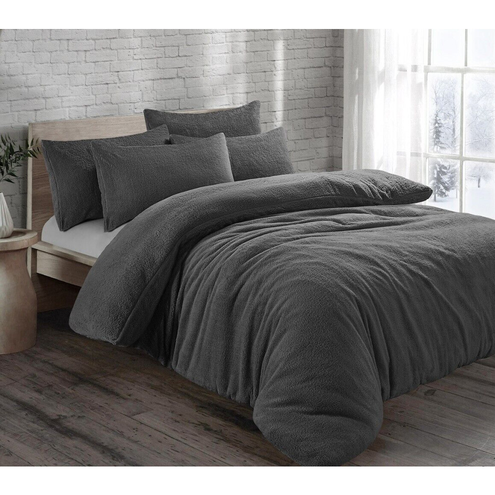 (Double , Charcoal) Teddy Bear Duvet Cover Fleece Bedding Set With Pillowcases Extra Warm Cosy in All Sizes