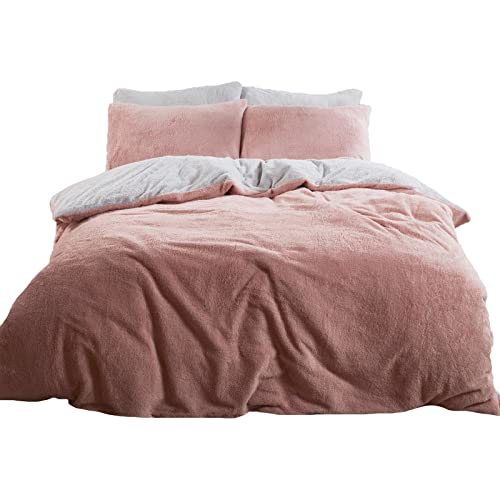 Brentfords Reversible Teddy Fleece Duvet Cover with Pillow Case Supersoft Cuddly Fluffy Thermal Warm Soft Bear Bedding Set, Blush Grey - Double