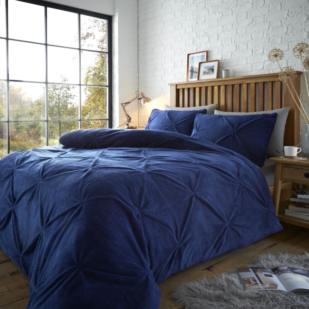 (Double, Navy) Luxury Teddy Bear Fleece Chiswick Pintuck Duvet Cover Bedding Set