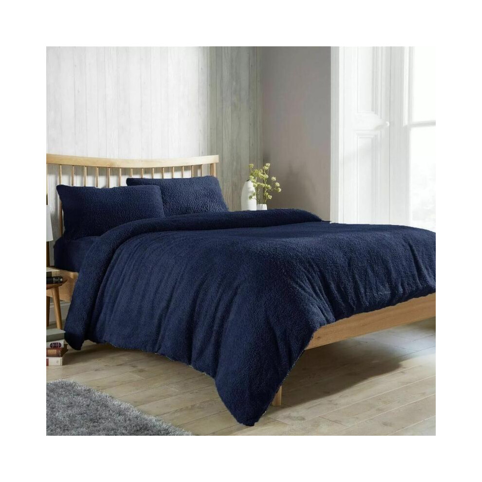 (Navy Blue, Super King) Teddy Bear Fleece Duvet Cover Set Sherpa Thermal Warm Soft Bedding & Pillowcases Available In Different Colour and Size