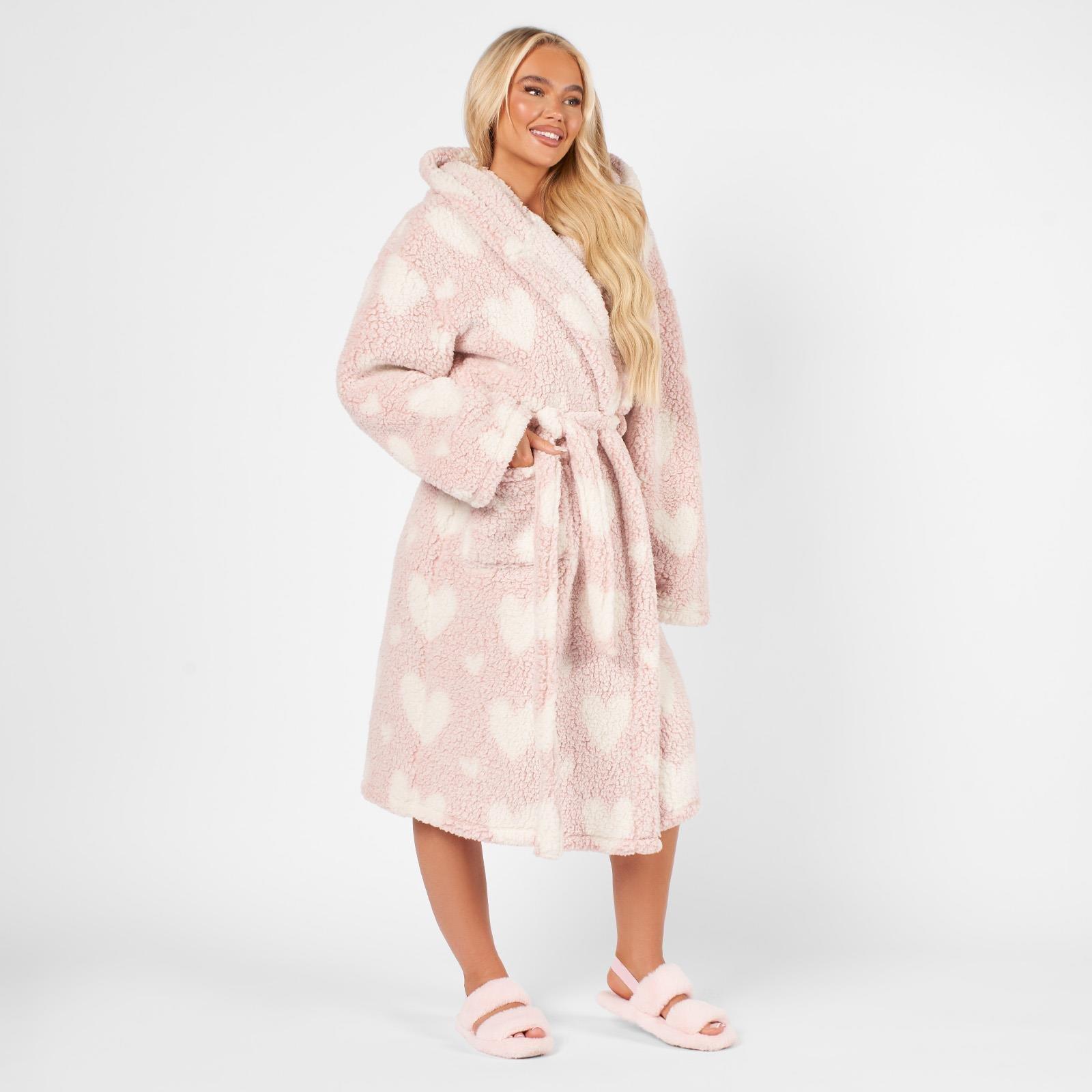 Heart Dressing Gown Soft Teddy Marl Fleece Hooded Robe