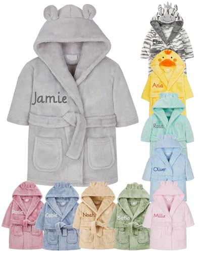 Gembroidery Personalised Baby Bathrobe Hooded Fleece Dressing Gown Super Soft Gifts Bath Robe For Boys Girls Cute Teddy Ears (0-6 Grey)