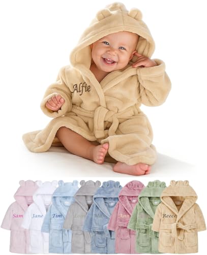 Hoolaroo Personalised Baby Dressing Gown Baby Dressing Gown Robe With Teddy Ears Bath Robe Towel Personalised Gifts Girl Boy Clothing White 6-12 Months