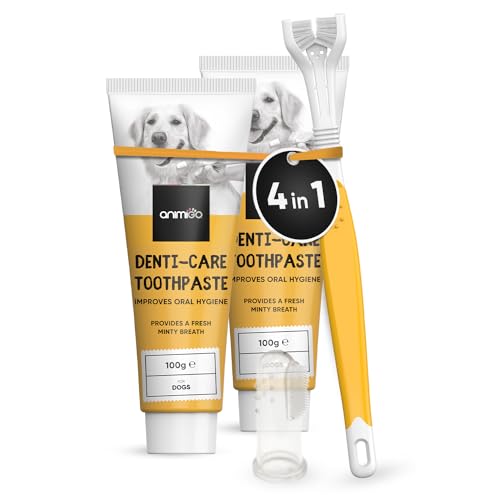 Dog Toothbrush and Toothpaste Kit - 2X Dog Toothpaste for Plaque and Fresh Breath (100g Each), 1x Triple-Head Dog Tooth Brush to Remove Tartar & 1x Dog Finger Toothbrush - Dog Teeth Cleaning Products