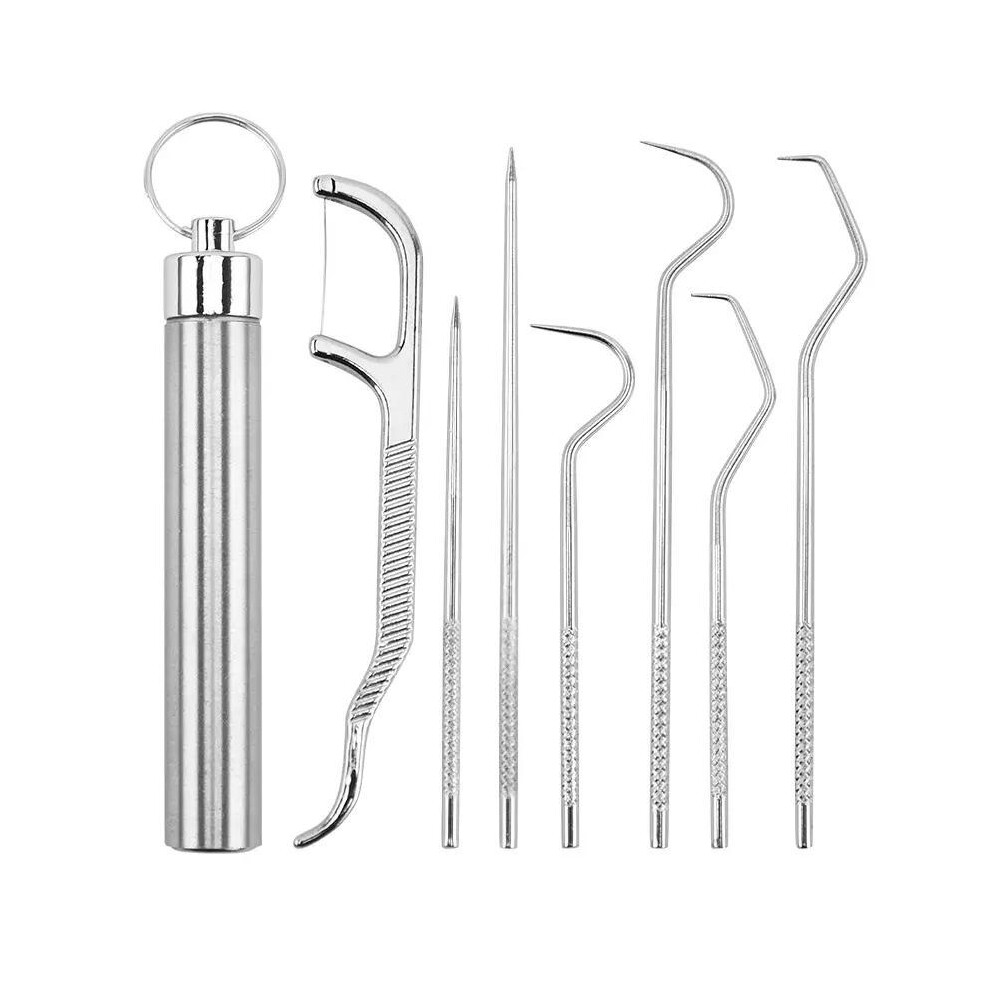 (Silver, one-size) Stainless Steel Toothpick Pocket Set, Teeth Cleaning Kit Keychain Design, Metal Toothpicks Oral Care Hygiene Products