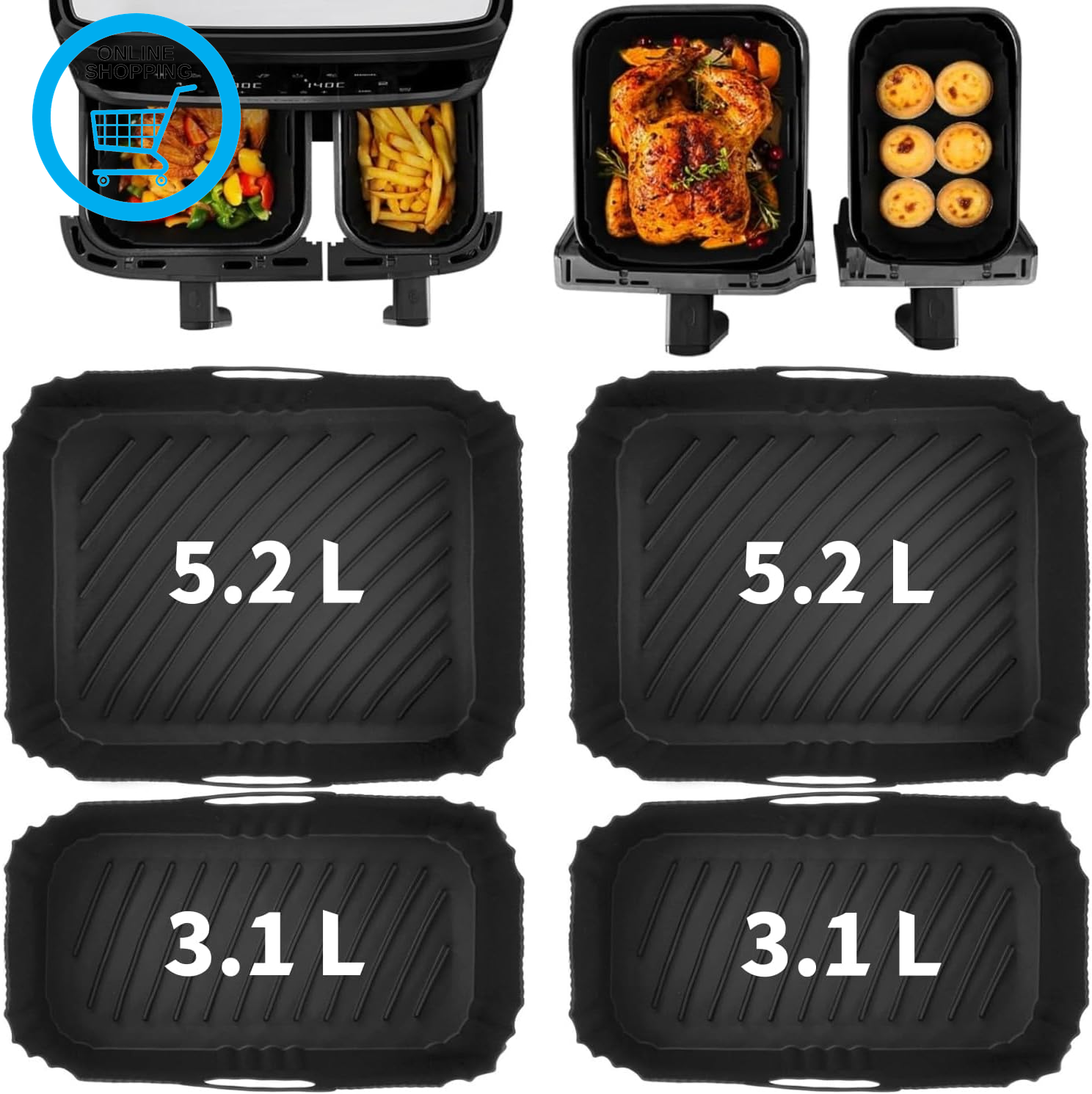 4Pcs Silicone Air Fryer Liners, 2 Size Reusable Dual Air Fryer Liners for Tefal
