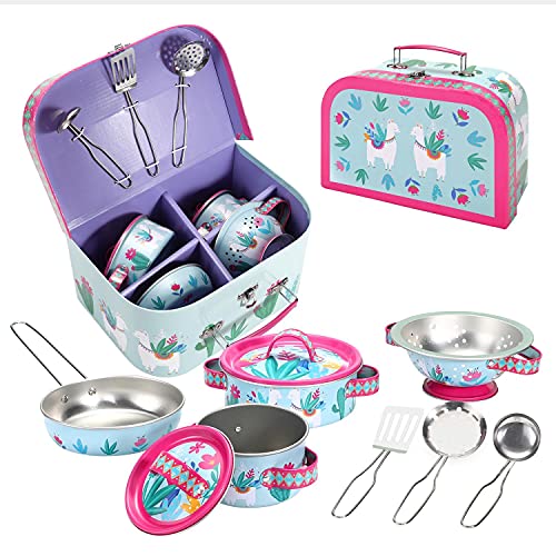 SOKA Llama Metal Kids Kitchen Set with Carry Case - 10 Pcs Illustrated Colourful Design Pretend Role Play Toy Pots and Pans Set Toy Kitchen Accessories for Children Boys Girls