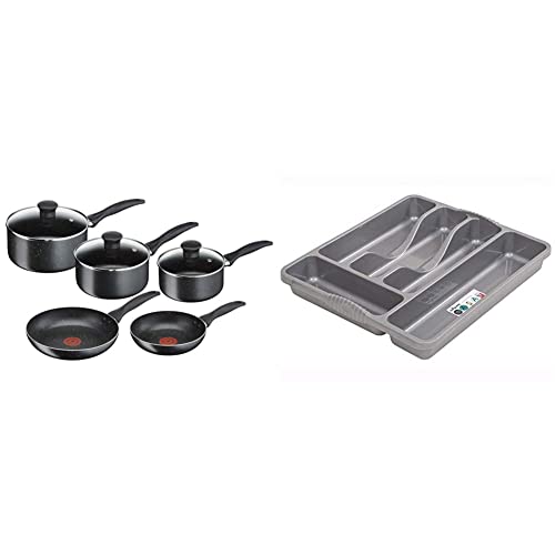 Tefal 5 Piece Origins Stone Pots and Pans Set, Non Stick, Aluminium, Black, & Wham Silver 5 Compartment Plastic Cutlery Holder Tray Drawer Organiser Rack