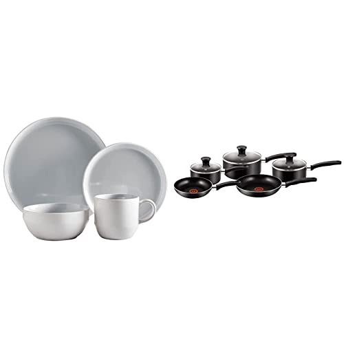 Barbary & Oak BO867004GRY Oslo 16 Piece Dinnerware Set, Stoneware, White and Nimbus Grey & Tefal 5 Piece, Essential, Pots and Pans Set, Non Stick, Aluminium, Black, 5 Count (Pack of 1)