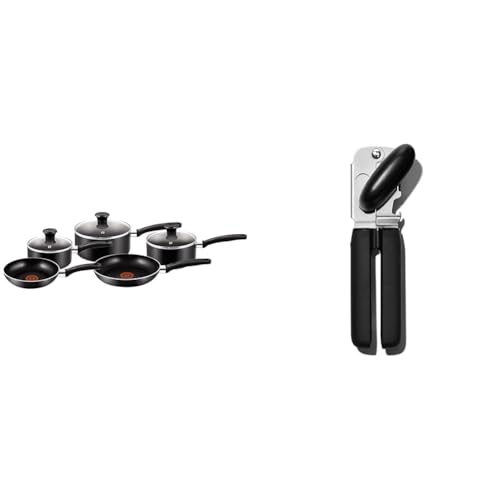 Tefal Essential, Aluminium Pots and Pans Set, 16 cm, 18 cm and 20 cm Saucepans with Lids, 20 cm and 24 cm Frying Pans, Black, B472S545 & OXO Good Grips Soft Handled Tin Opener