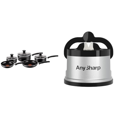 Tefal Essential, Aluminium Pots and Pans Set, 16 cm, 18 cm and 20 cm Saucepans with Lids & AnySharp Knife Sharpener, Hands-Free Safety, PowerGrip Suction, Safely Sharpens All Kitchen Knives