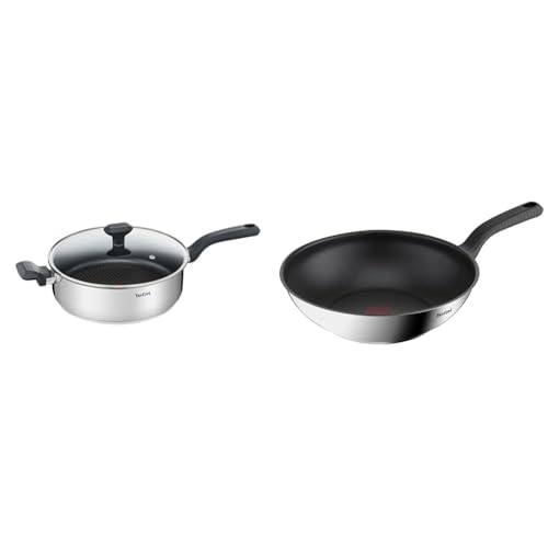 Tefal 26cm Comfort Max Stainless Steel Non-Stick Saute Pan and Lid, Silver & 28cm Comfort Max Stainless Steel Non-Stick Wok, Silver