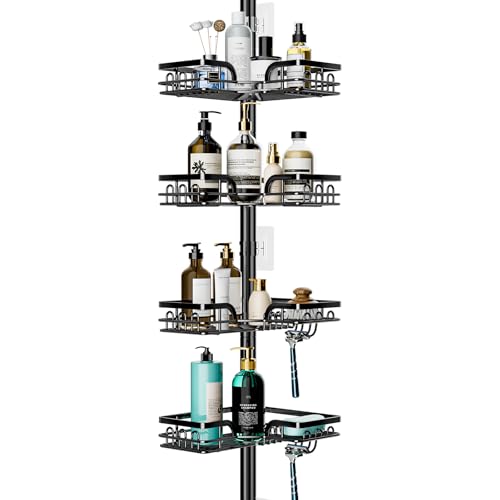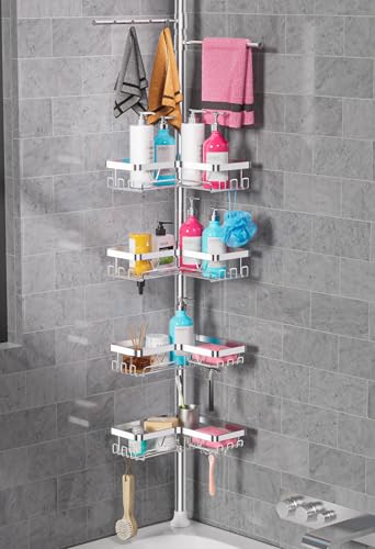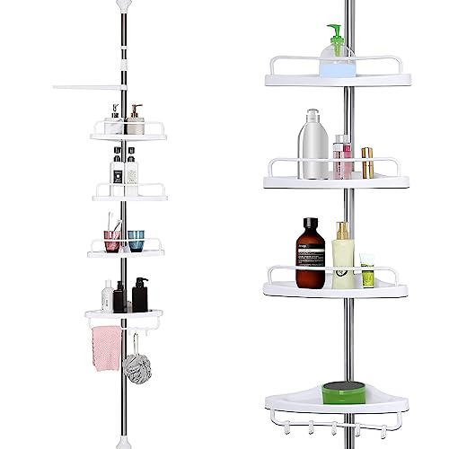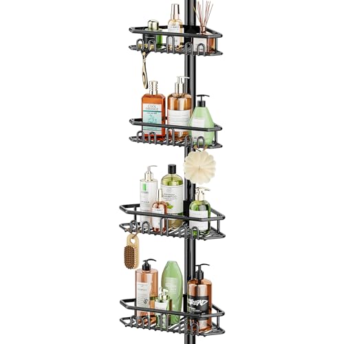 HapiRm Telescopic Shower Caddy Corner - Height Adjustable Bathroom Shelf from 26.4 to 108.3 inch, Rustproof Shower Caddy with 4 Tier & 22 Hooks, No Drilling Shower Shelf, Bathroom Shelves