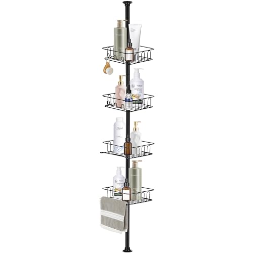 SWTYMIKI Telescopic Shower Caddy Corner - Rustproof Shower Corner Shelves with Towel Bar & Soap Holder, Adjustable No Drilling Organizer for Bathroom Storage With 4 Baskets,27.6-108.3 inch, Black