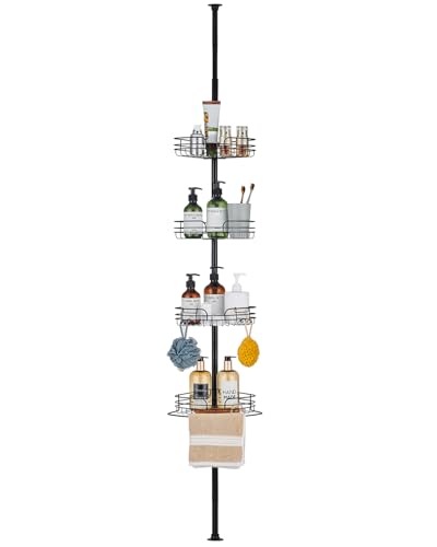 SONGMICS Shower Caddy, Telescopic Corner Shower Shelf for Bathroom, 95-300 cm High Pole, Stainless Steel, with 4 Shelves, 3 Hooks, 1 Towel Bar, Metallic Silver and Ink Black BCB002B01