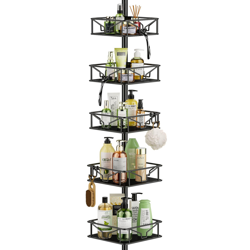 Mutool Adjustable Shower Shelf, Telescopic Shower Caddy with Hooks, No Drilling Corner Shelf with 5 Trays, Rustproof Bathroom Organizer from 157 to 294 CM, Black