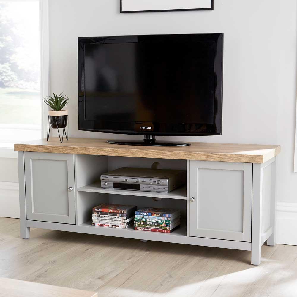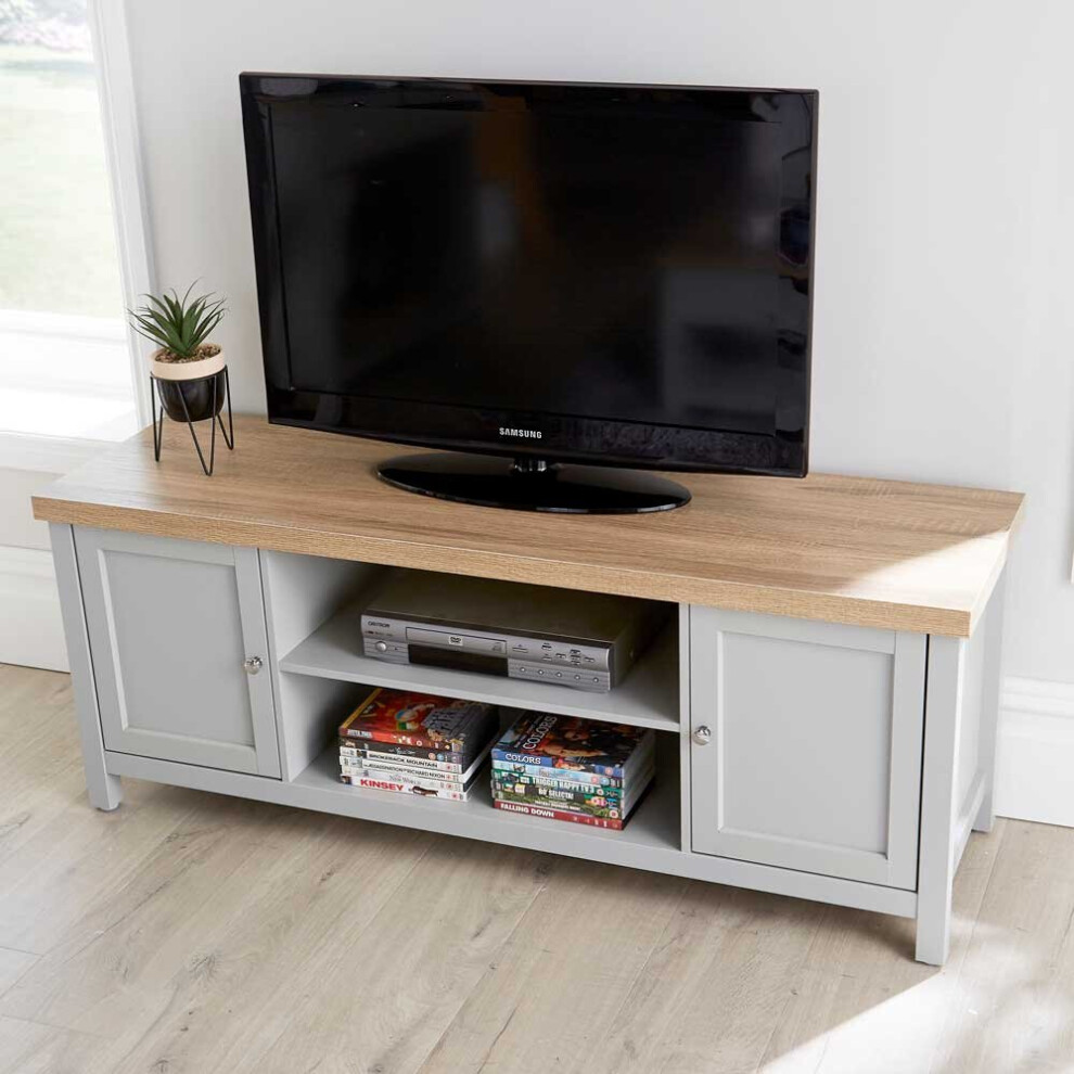 Farro Grey 120cm Large TV Unit for Living Room | Roseland Furniture Fully Assembled Painted Solid Wooden Television Cabinet Stand Oak Top | Suitable for TVs up to 54 inches